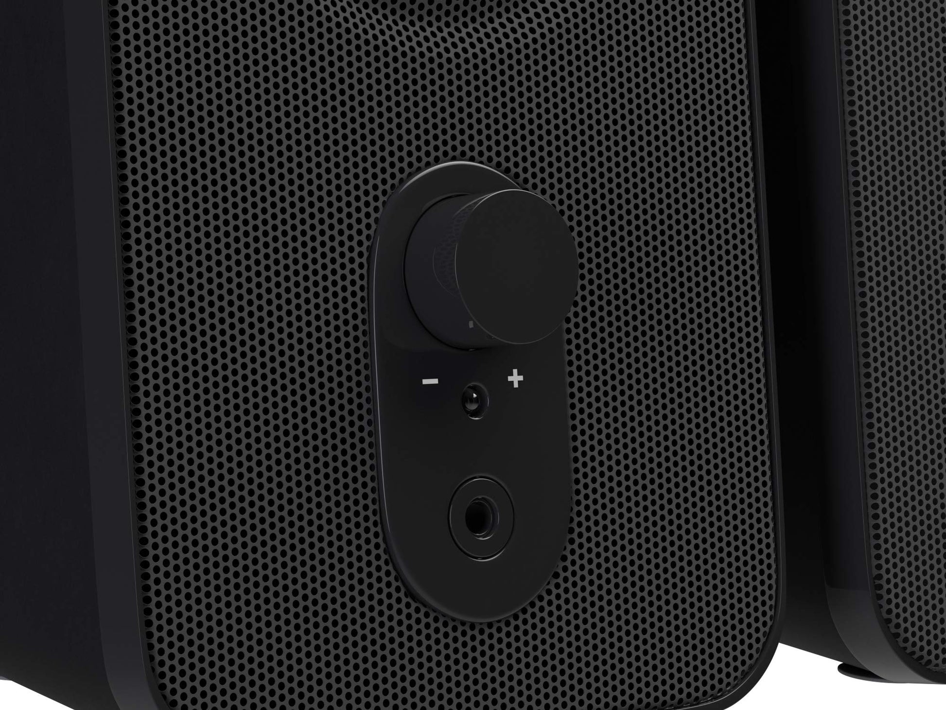 - Anschaltung und Lautstärkeregelung mittels einem einfachem Drehregler (vorne an den Lautsprechern). Lautstärkeregelung sowie Anschalten/Standby werden über ein und denselben Regler getätigt