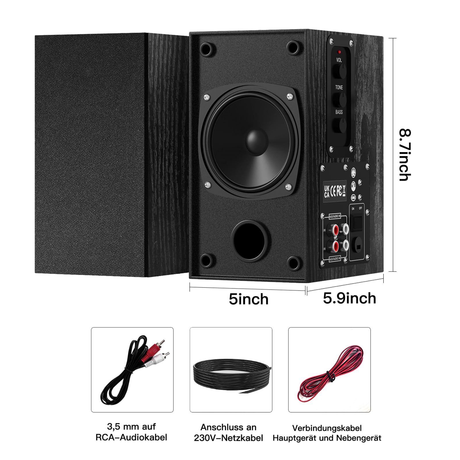 Elimavi Aktive Regallautsprecher, Computerlautsprecher mit 4"-Tieftöner, 3,5 mm auf RCA Aux Lautsprecher für Plattenspieler Holzstruktur Kann an Der Wand Montiert Werden